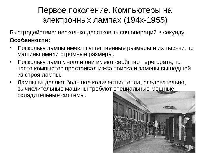 Первое поколение. Компьютеры на электронных лампах (194 х-1955) Быстродействие: несколько десятков тысяч операций в секунду. Особенности: • Поскольку лампы имеют существенные размеры и их тысячи, то машины имели огромные размеры. • Поскольку ламп много и они имеют свойство перегорать, то часто компьютер простаивал из-за поиска и замены вышедшей из строя лампы. • Лампы выделяют большое количество тепла, следовательно, вычислительные машины требуют специальные мощные охладительные системы.