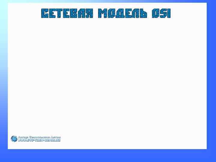 Уровни модели OSI Модель OSI Уровень (layer) Тип данных (PDU[1]) 7. Прикладной (application) 6. Представительский (представления) (presentation) Функции Примеры Доступ к сетевым службам Представление ишифрование данных ASCII, EBCDIC, JPEG Управление сеансом связи Данные HTTP, FTP, SMTP RPC, PAP Host layers 5. Сеансовый (session) 4. Транспортный (transport) Прямая связь между конечными пунктами и надежность TCP, UDP 3. Сетевой (network) Media[2] layers Сегменты(segment) Пакеты(packet)/ Дейтаграммы(datagram) Определение маршрута и логическая адресация IPv 4, IPv 6, IPsec, Apple. Talk 2. Канальный (data link) Биты (bit)/ Кадры(frame) Физическая адресация PPP, IEEE 802. 2, L 2 TP, ARP 1. Физический (physical) Биты (bit) Работа со средой передачи, сигналами и двоичными данными DSL, USB