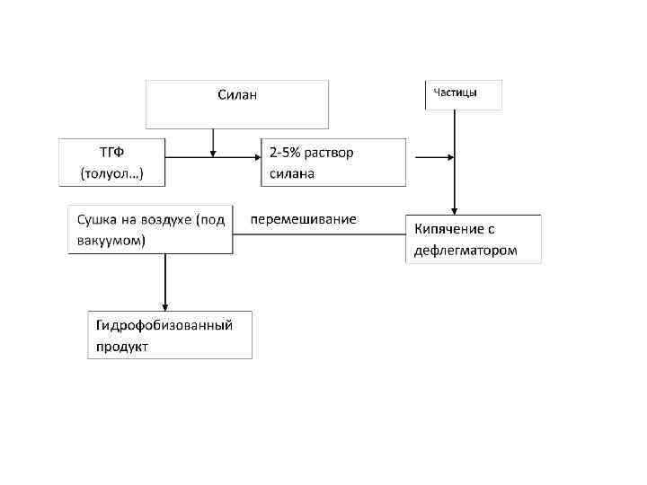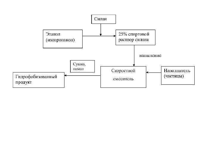 уксусная кислота 95% этанол силан 95% этанол, р. Н = 45 отмывка в этаноле избытка силана сушка, Т=110 -120 С гидрофобизованный продукт Погружение в объем на 2 -3 мин модифицируемая поверхность (порошок) раствор гидрофобизатора
