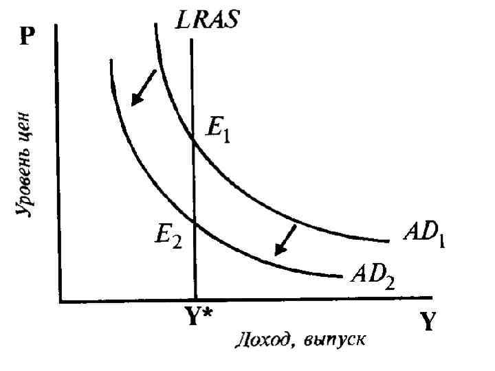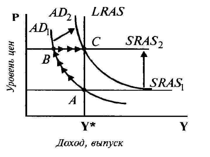 • Аналогичный процесс происходит при снижении совокупного спроса. Только в этом случае начальное снижение объемов производства и занятости затем компенсируется снижением цен и возвращением к долгосрочному равновесному объему национального производства. В результате колебания краткосрочных параметров равновесия происходят возле величины долгосрочного равновесного объема национального производства в результате приспособления к нему совокупного спроса путем коррекции уровня цен.
