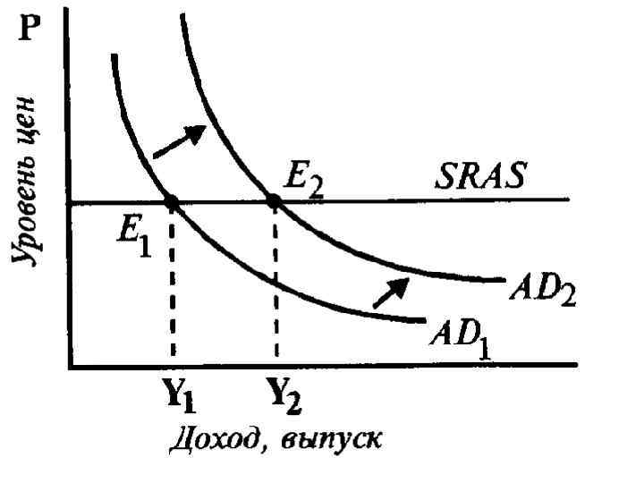 Кейнсианская (краткосрочная) модель AS • Эта модель предполагает, что экономика функционирует в условиях жесткости цен и неполного использования ресурсов. Поэтому реальные величины (объемы производства, занятость и т. п. ) более чувствительны к колебаниям совокупного спроса и объем выпуска в экономике определяется уровнем совокупного спроса. • График такого совокупного предложения (SRAS) будет представлять собой горизонтальную прямую, пересекающую вертикальную ось в точке, соответствующей сложившемуся в экономике уровню цен.