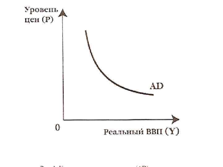 График совокупного спроса • Кривая совокупного спроса AD показывает количество товаров и услуг, которое потребители готовы приобрести при каждом возможном уровне цен. Простейшей формой этой зависимости может служить известная формула И. Фишера: MV = PY, откуда Y = MV/P • Эта формула показывает, что при данной денежной массе и скорости обращения денег спрос на товары и услуги находится в обратной зависимости от уровня цен.