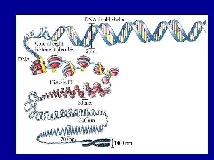 Рівні організації молекули ДНК 1. Первинна – лінійна послідовність нуклеотидів, що пов”язані фосфодифірними зв”язками 2. Вторинна – подвійний комплементарний ланцюг 3. Третинна – додаткова спіралізація при утворенні хромосом та хроматину