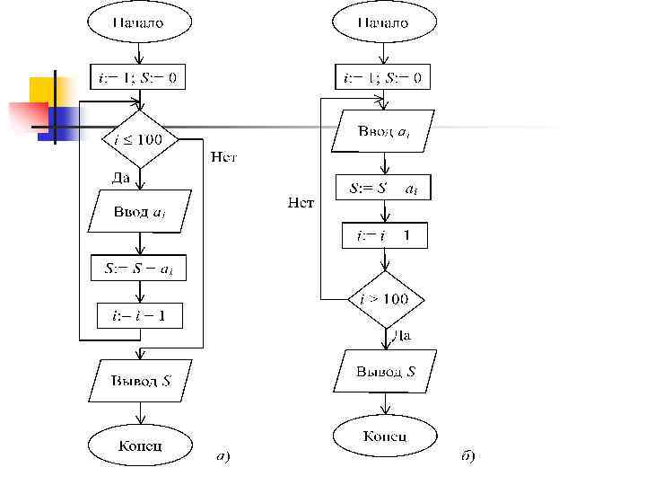 Структурная теорема n Любую схему алгоритма можно представить в виде композиции вложенных блоков begin и end, условных операторов if, then, else, циклов с предусловием (while) и может быть дополнительных логических переменных
