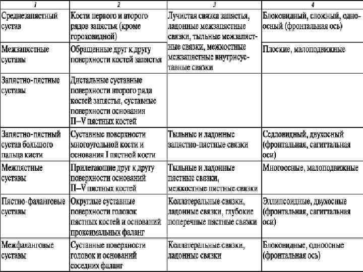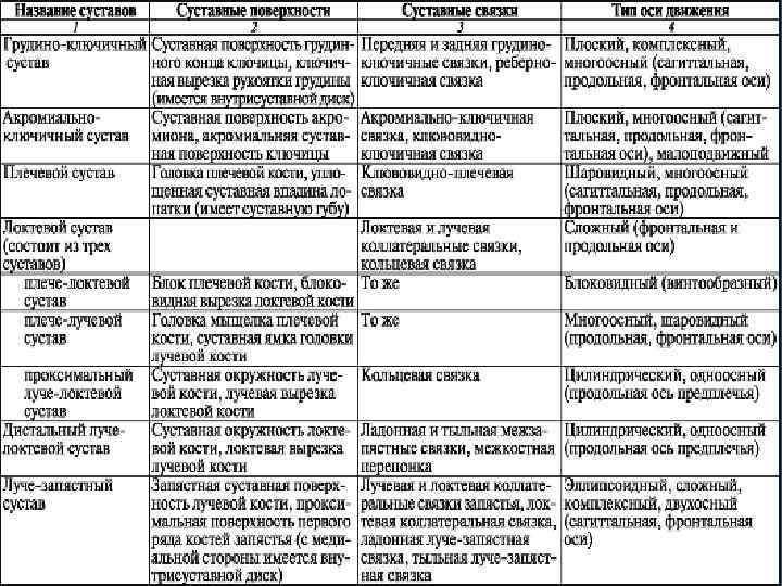 Соединения костей верхней конечности Название суставов Характеристика по форме строению движению Грудино-ключичный седловидный простой многоосный вокруг 3 х осей Акромиальноключичный плоский простой малоподвижный Плечевой шаровидный простой многоосный Локтевой блоковидный сложный одноосный Лучелоктевые цилиндрические простые супинация пронация Лучезапястный эллипсовидный сложный эллипсовидный Запястно-пястные плоские простые малоподвижные седловидный Пястно-фаланговые шаровидные простые многоосные Межфаланговые блоковидные простые одноосные