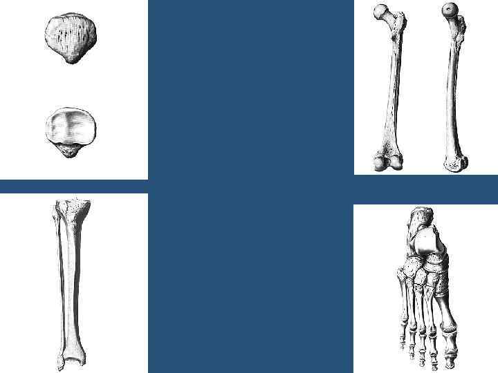 Кости нижней конечности Скелет нижней конечности делят на кости, образующие пояс нижней конечности (тазовые кости) и скелет свободной нижней конечности, который в области бедра представлен бедренной костью, в области голени - большеберцовой костью и малоберцовой костью (образуют соответственно медиальную и латеральную лодыжки) и кости стопы - предплюсны (7), плюсны (5), и костями пальцев стопы (14).
