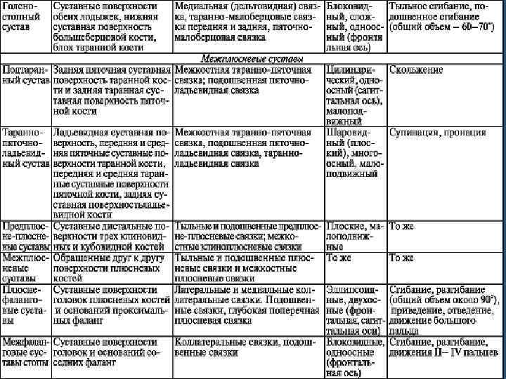 сустав тазобедренный коленный голеностопный суставы стопы Форма В виде шара или сферы Блоковидный Имеет множество видов Состав костей Две разные кости, соединенные в одну поверхность Включает в себя бедренно-надколенное и бедреннобольшеберцовое соединения Включает в себя таранную кость, лодыжку, нижнюю малоберцовую кость Множество костей, связанных друг с другом Отвечает за движения Сгибает, разгибает, совершает круговые движения, ротация Сгибает, разгибает, ротация в некоторых углах Сгибает, разгибает Ротация Функции Обеспечивает прямохождение и удерживает тело во время сидения Прочно фиксирует прямо Удерживает и при стоячем положении фиксирует стопу и приобретает огромную подвижность при сидении Поддерживает и удерживает стопу Особенно сти анатомии имеется внутрисуставная связка головки бедра Имеет мениски, несколько внутрисуставных связок и костных образований. Обладает дополнительной костью – надколенником Имеет сложную степень кровообращения Имеет высокую степень подвижности Дополнительные степени свободы появляются за счёт подвижности сочленения большеберцовой и малоберцовой кости