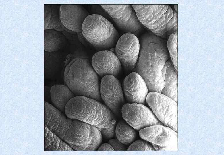 Всасывающая поверхность тонкой кишки у человека 400‑ 500 м 2 Наибольшее количество ворсинок находится в тощей кишке и здесь они самые длинные (у человека 30 -40 ворсинок на 1 мм 2, длина – до 1, 2 мм). В двенадцатиперстной и подвздошной кишке они короче (до 0, 7 мм) и расположены реже (10‑ 30 ворсинок на 1 мм 2). Пул эпителиальных клеток включает несколько типов клеток, имеющих особенности в расположении и функциях. Большая часть эпителиальных клеток ворсинок представлена каемчатыми эпителиоцитами, клеточная мембрана которых имеет со стороны просвета кишки множество плотнорасположенных выростов – микроворсинок (высотой до 2 мкм, общее количество – 4000 на клетку). Благодаря наличию складок слизистой, ворсинок и микроворсинок общая всасывающая поверхность тонкой кишки достигает у человека 400‑ 500 м 2.