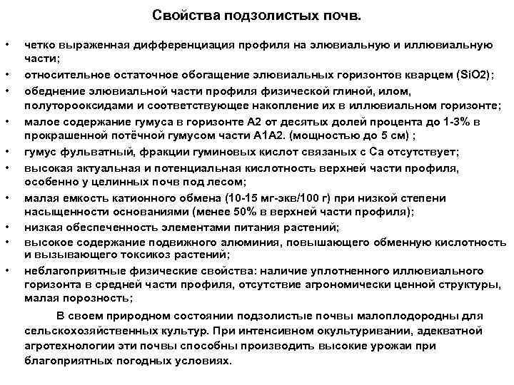 Свойства подзолистых почв. • • • четко выраженная дифференциация профиля на элювиальную и иллювиальную части; относительное остаточное обогащение элювиальных горизонтов кварцем (Si. O 2); обеднение элювиальной части профиля физической глиной, илом, полуторооксидами и соответствующее накопление их в иллювиальном горизонте; малое содержание гумуса в горизонте А 2 от десятых долей процента до 1 -3% в прокрашенной потёчной гумусом части А 1 А 2. (мощностью до 5 см) ; гумус фульватный, фракции гуминовых кислот связаных с Ca отсутствует; высокая актуальная и потенциальная кислотность верхней части профиля, особенно у целинных почв под лесом; малая емкость катионного обмена (10 -15 мг-экв/100 г) при низкой степени насыщенности основаниями (менее 50% в верхней части профиля); низкая обеспеченность элементами питания растений; высокое содержание подвижного алюминия, повышающего обменную кислотность и вызывающего токсикоз растений; неблагоприятные физические свойства: наличие уплотненного иллювиального горизонта в средней части профиля, отсутствие агрономически ценной структуры, малая порозность; В своем природном состоянии подзолистые почвы малоплодородны для сельскохозяйственных культур. При интенсивном окультуривании, адекватной агротехнологии эти почвы способны производить высокие урожаи при благоприятных погодных условиях.