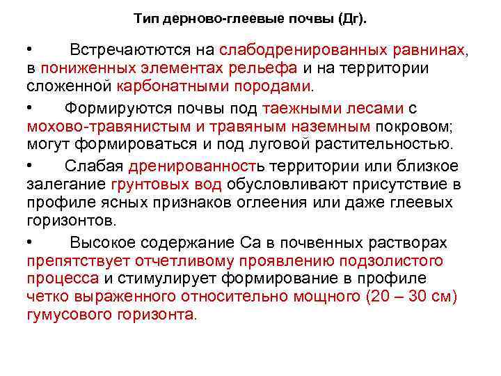Тип дерново-глеевые почвы (Дг). • Встречаютются на слабодренированных равнинах, в пониженных элементах рельефа и на территории сложенной карбонатными породами. • Формируются почвы под таежными лесами с мохово-травянистым и травяным наземным покровом; могут формироваться и под луговой растительностью. • Слабая дренированность территории или близкое залегание грунтовых вод обусловливают присутствие в профиле ясных признаков оглеения или даже глеевых горизонтов. • Высокое содержание Са в почвенных растворах препятствует отчетливому проявлению подзолистого процесса и стимулирует формирование в профиле четко выраженного относительно мощного (20 – 30 см) гумусового горизонта.