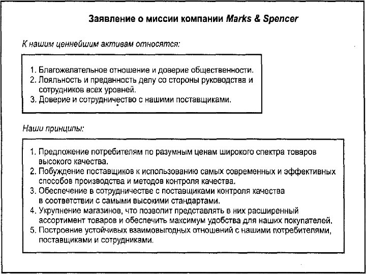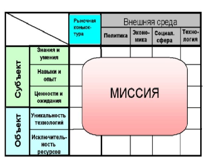 Миссия в широком понимании представляет собой • деловую концепцию компании, изложенную в виде 8 -ми меморандумов: • что получит Заказчик в части удовлетворения своих потребностей, • кто, для чего и как может выступать в качестве партнера компании, • на какой основе предполагается строить отношения с конкурентами (какова, в частности, готовность пойти на временные компромиссы), • что получит собственник и акционеры от бизнеса, • что получат от бизнеса и компании менеджеры, • что получит от компании персонал, • в чем может заключаться сотрудничество с общественными организациями, • как будут строиться отношения компании с государством (в частности возможное участие в поддержке государственных программ).