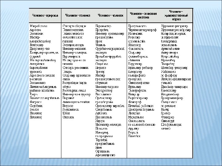 ТИПЫ ПРОФЕССИЙ По основному предмету труда все профессии подразделяются на пять главных типов: "человек-человек « (Ч), "человек-техника « (Т), "человек-знаковая система « (З), "человек-художественный образ « (Х), "человек-природа « (П).