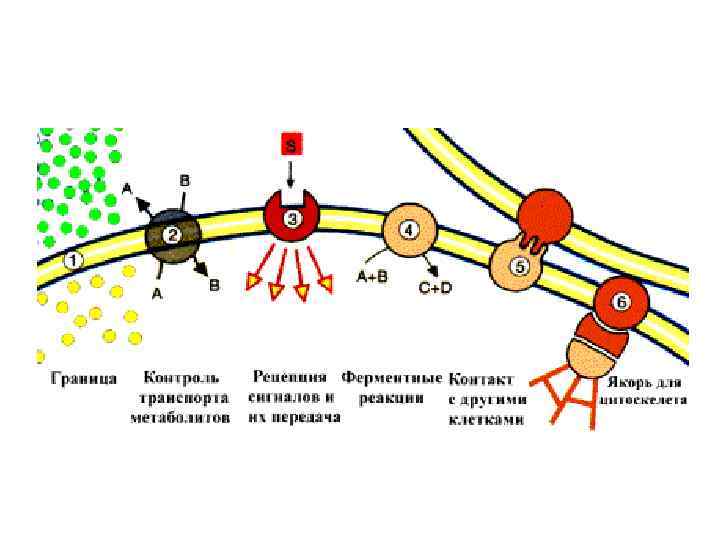 Различные категории монотопических белков. • • • 1 – белки, связанные с интегральными белками (сукцинатдегидрогеназа); 2 – белки, присоединенные к полярным «головкам» липидного слоя за счёт электростатического взаимодействия (прямого или кальций-опосредованного). (протеинкиназа С); 3 – белки, вязанные с мембраной амфипатической альфа-спиралью, параллельной плоскости мембраны, 4 - белки, «заякоренные» в мембране с помощью короткого гидрофобного концевого домена (цитохром b 5); 5 – белки «заякоренные» в мембране за счет жирнокислотного радикала, ковалентно присоединенного к белковой молекуле (G-белок).