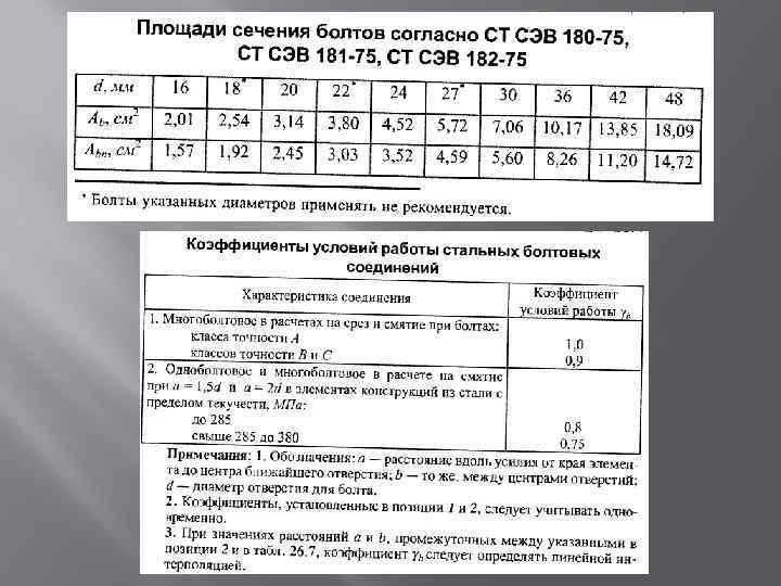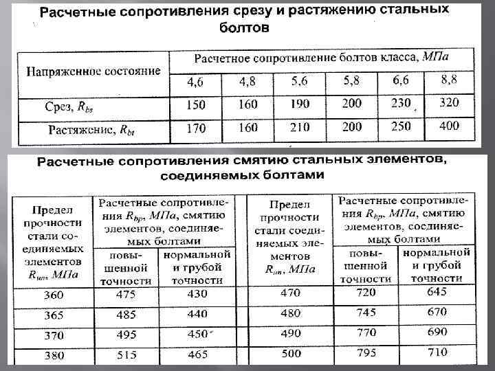 определяется по формуле -из условия работы на срез ; -из условия работы на смятие ; - из условия работы на растяжение , где - расчетные сопротивления болтовых соединений, определяемые по таблицам 58, 59 (СНи. П РК. 5. 04. 23 -2002 Нормы проектирования. Стальные конструкции. - Астана, 2003. -118 с); - расчетная площадь сечения стержня болта, таблица 62; - площадь сечения болта нетто, таблица 62; - наименьшая суммарная толщина элементов, сминаемых в одном направлении; - число расчетных срезов одного болта (на единицу меньше количества сопрягаемых элементов); - коэффициент условий работы соединения, принимаемый для многоболтовых соединениях класса точности А – 1, 0, класса