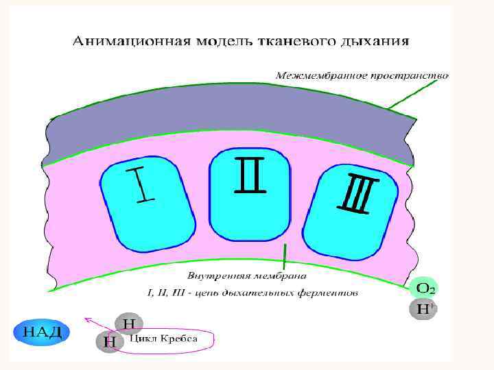 • Ферменты тканевого дыхания Комплекс I – НАДН-дегидрогеназа – флавопротеин, содержащий ФМН. Этот фермент окисляет НАДН и передает два водорода (2 Н+2 е-) на коэнзим Q. В комплекс входят также Fe-S-белки. • Комплекс II – сукцинатдегидрогеназа – флавопротеин, содержащий ФАД. Этот фермент окисляет сукцинат и передает два водорода (2 Н+2 е-) на коэнзим Q. В составе комплекса есть Fe-S-белки. • Комплекс III – убихинондегидрогеназа – ферментный комплекс, состоящий из цитохрома b, Fe-S-белка и цитохрома с1. Этот комплекс транспортирует электроны 2 е- от восстановленного убихинона Ко. QН 2 на цитохром с (небольшой по размерам водорастворимый белок, находится на внешней стороне внутренней мембраны).