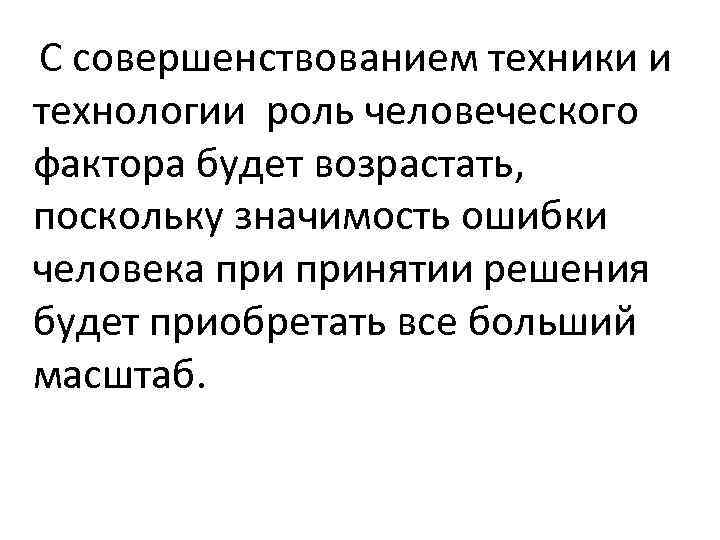 C совершенствованием техники и технологии роль человеческого фактора будет возрастать, поскольку значимость ошибки человека принятии решения будет приобретать все больший масштаб.