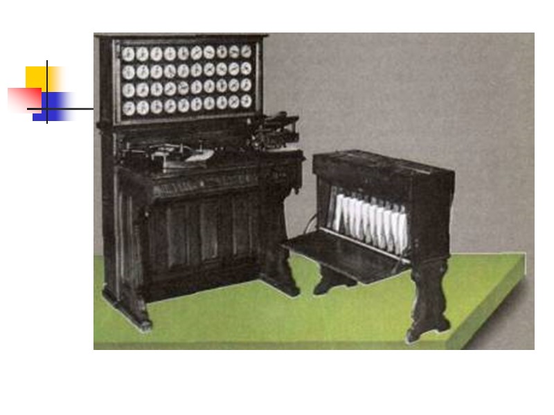 Герман Холлерит (1860- 1929) В 1888 г. американский ученый Герман Холлерит сконструировал первую электромеханическую машину для сортировки и подсчета перфокарт - табулятор. Эта машина содержала реле, счетчики, сортировочный ящик и впервые была использована при подведении итогов переписи населения в США. В 1896 г. Г.Холлерит основал фирму Computing Tabulation Company, в 1924 г. Ставшую всемирно известной фирмой IBM (International Business Machine Corporation). Предшественники ЭВМ