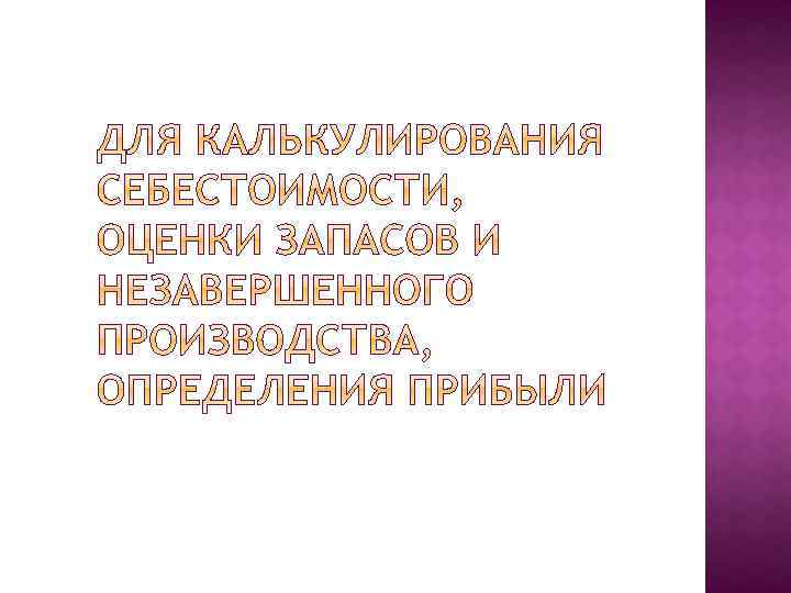 для калькулирования себестоимости, оценки запасов и незавершенного производства, определения прибыли; для принятия управленческих решений, планирования и прогнозирования; для осуществления контроля и регулирования.