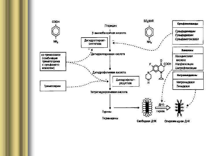 триметроприм– синергист СА, • блокируетдегидрофолатредуктазу и нарушает переход ДГФК в ТГФК, этап синтеза пуриновых и пиримидиновых оснований. • ТР оказывает бактериостатическое действие и только сочетание СА с триметопримом ведет к возникновению бактерицидного эффекта. • У ТР меньшая избирательность действия, поскольку нарушает использование фолиевой кислоты макроорганизмом и ведет к ее дефициту в организме.