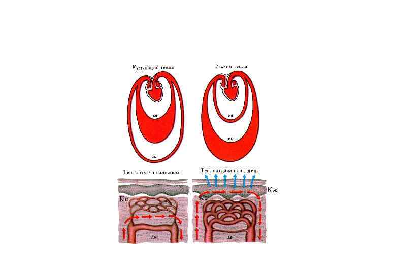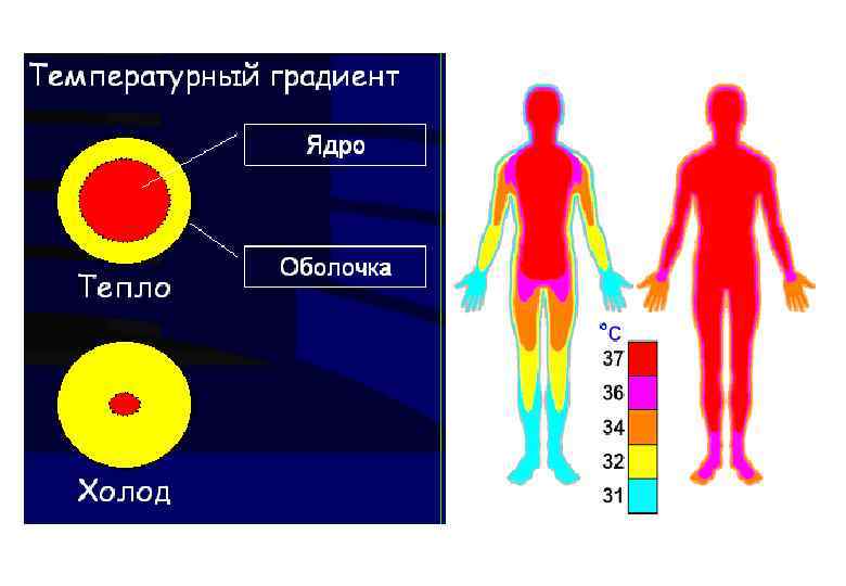 • • • С. 481 В теле человека принято различать «ядро» , температура которого сохраняется достаточно постоянной, и «оболочку» , температура которой существенно колеблется в зависимости от температуры внешней среды (рис. 10. 1). При этом область «ядра» сильно уменьшается при низкой внешней температуре и, наоборот, увеличивается при относительно высокой температуре окружающей среды. Поэтому справедливо говорить о том, что изотермия присуща главным образом внутренним органам и головному мозгу. Поверхность же тела и конечности, температура которых может изменяться в зависимости от температуры окружающей среды, имеют различную температуру в зависимости от удаленности от «ядра» и степени защищенности одеждой. Так, температура кожи туловища и головы равна 32— 34 °С; на участках кожи, покрытых одеждой, 30— 32 °С; на пальцах ног, кончике носа, ушной раковине 22 °С; на открытой тыльной стороне ладоней в холодное время года до 12— 14 °С.