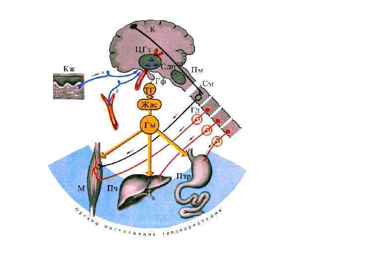 Химическая специфичность центров терморегуляции Увеличение теплоотдачи • Бомбезин (родственный ему гастринрилизинг пептид) • Вазопрессинергическая система • Кортикотропинергическая система Увеличение теплопродукции • тиреолиберинергическая