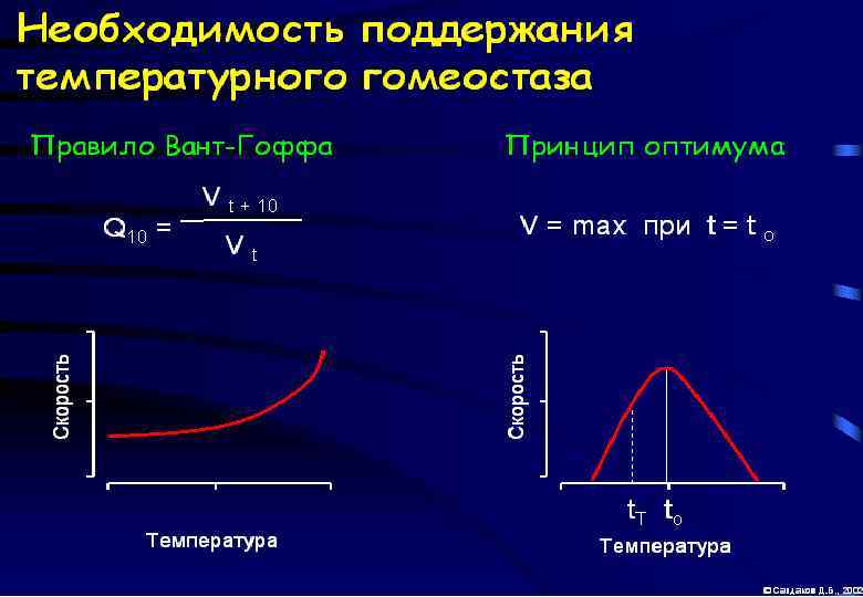 Правило Вант‑Гоффа — Аррениуса • Скорость любой химической реакции прямо пропорционально температуре среды. • Количественно эта зависимость описывается коэффициентом Q 10: Q 10 = Kt+10 / Kt, где Kt, — скорость химической реакции при начальной температуре (t), Kt+10 — скорость той же реакции при температуре на 10º выше (t + 10º). • Для большей части химических реакций происходящих в организме человека Q 10 = 2 ÷ 3.