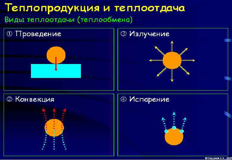 Теплоотдача (физическая терморегуляция) Русский яз. Латинский яз. Условное обозначение Проведние, кондукция Излучение, радиация Конвекция Conductio K Radiatio R Convectio C Испарение Evaporatio E