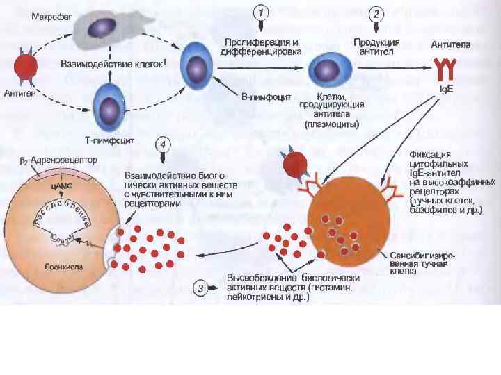 Реакции гиперчувствительности (АР) подразделяют на следующие типы: 1. Немедленные реакции (ч/з мин или часы после повторного контакта с АГ). 2. Замедленные реакции (через 2 -3 сут и позже). Реакции немедленного типа (АРНТ) обусловлены взаимодействием АГ с АТ. Продуцентами АТ являются плазмоциты. Цитофильные АТ фиксир-я на R клеток (тучных клеток, базофилов). Взаимод-е аллергена с АТ→ к повреждению тканей (от ƒ изменений до некроза). В развитии АРНТ играет высвобождение из тучных клеток и базофилов БАВ (гистамин, «медленно реагирующая субстанция анафилаксии» (МРСА, или SRSA), брадикинин, серотонин, ПГ, (ФАТ; РАF). К АРНТ относятся: аллергические бронхоспазм, ринит, конъюнктивит, крапивница, анафилактический шок, лекарственная тромбоцитопеническая пурпура, сывороточная болезнь, феномен Артюса.