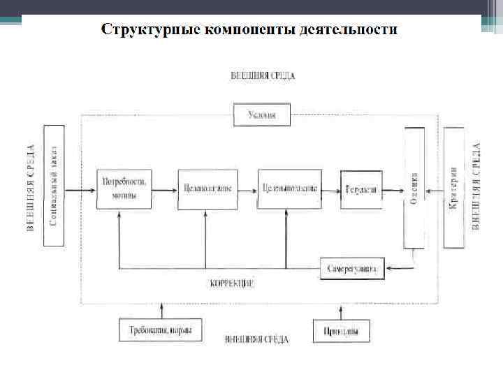 Саморегуляция • Саморегуляция – целесообразное функционирование живых систем. • Структура саморегуляции: принятая субъектом цель его деятельности – модель значимых условий деятельности – программа исполнительских действий – система критериев успешности деятельности – информация о реально достигнутых результатах – оценка соответствия реальных результатов критериям успеха – решение о необходимости и характере коррекции деятельности