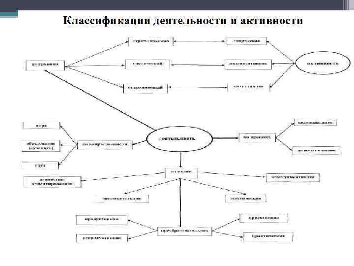 Классификации деятельности • - по уровням (операционный, тактический, стратегический); • - по процессу (целеполагание – целевыполнение); • - по видам (ценностно-ориентировочная, познавательная, преобразовательная. Коммуникативная, эстетическая); • - по направленности (игра, учение, труд). • Все вышерассмотренное есть процессуальная структура деятельности. • Помимо нее выделяют еще логическую и временную структуру деятельности.