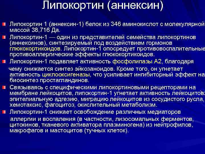 Липокортин (аннексин) Липокортин 1 (аннексин-1) белок из 346 аминокислот с молекулярной массой 38, 716 Да. Липокортин-1 — один из представителей семейства липокортинов (аннексинов), синтезируемый под воздействием гормонов глюкокортикоидов. Липокортин-1 опосредует противовоспалительные противоаллергические эффекты глюкокортикоидов. Липокортин-1 подавляет активность фосфолипазы A 2, благодаря чему снижается синтез эйкозаноидов. Кроме того, он угнетает активность циклооксигеназы, что усиливает ингибиторный эффект на биосинтез простагландинов. Связываясь с специфическими липокортиновыми рецепторами на мембране лейкоцитов, липокортин-1 угнетает активность лейкоцитов: эпителиальную адгезию, миграцию лейкоцитов из сосудистого русла, хемотаксис, фагоцитоз, окислительный метаболизм. Липокортин-1 снижает освобождение различных медиаторов аллергии и воспаления (в частности, лизосомальных ферментов, цитокинов, тканевого активатора плазминогена) из нейтрофилов, макрофагов и мастоцитов (тучных клеток).