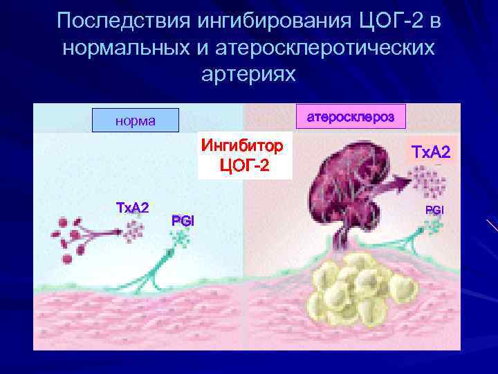 Последствия ингибирования ЦОГ-2 в нормальных и атеросклеротических артериях атеросклероз норма Ингибитор ЦОГ-2 Tx. A 2 PGI