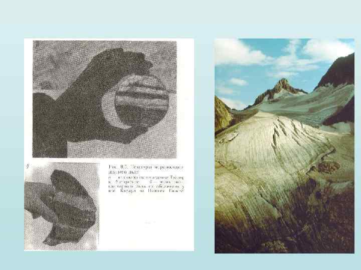СТРУКТУРЫ МОРЕНОСОДЕРЖАЩЕГО ЛЬДА ВДОЛЬ ПЛОСКОСТЕЙ ВНУТРЕННИХ СКОЛОВ РАСПОЛОЖЕНЫ ПРОСЛОИ ЛЕДОГРУНТА И СЕРИИ ПЛОСКИХ ПУЗЫРЬКОВ КРИСТАЛЛЫ ЛЬДА СЛАБО ОРИЕНТИРОВАНЫ ВДОЛЬ ПЛОСКОСТЕЙ СКОЛОВ; ОНИ ДРОБЯТСЯ ПЕРЕКРИСТАЛЛЛИЗУЮТСЯ И «КРУТЯТСЯ» В ХОДЕ ДВИЖЕНИЯ ЛЬДА