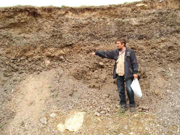 ГЛЯЦИОДИСЛОКАЦИИ В ПОДОШВЕ УСТЬ-КАНСКОЙ МОРЕНЫ Граница между мореной (бурая вверху) и смятыми в складки и диапиры структурным эллювием по палеозойским сланцам (серый внизу)
