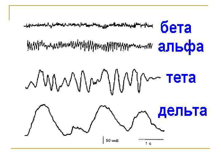 Ритмы ЭЭГ n альфа — 8— 13 Гц, n бета — 14— 40 Гц, n тета — 4— 6 Гц, n дельта — 0, 5— 3 Гц, n гамма — выше 40 Гц и др. .
