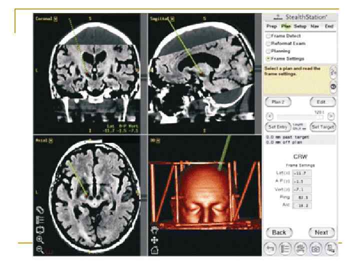 Стереотаксис n Сейчас стереотаксические системы с компьютеризированными средствами обеспечения расчётов, позволяющих планировать доступ к точке-цели по КТ-, МРТ, ПЭТ- изображениям мозга конкретного пациента.