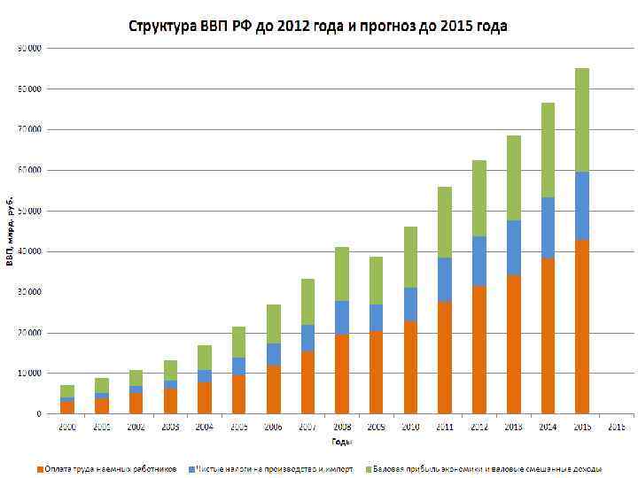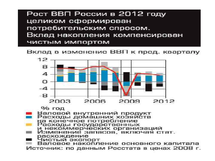 • Рост ВВП России в 2012 году, по предварительной оценке, составил 3, 4% и оказался ниже официального прогноза и оценки правительства в 3, 5%, сообщил Росстат. • Таким образом, рост российской экономики в прошлом году замедлился по сравнению с 2011 годом, когда рост ВВП составил 4, 3%. • «Объем ВВП России за 2012 год, по предварительной оценке, составил в текущих ценах 62 трлн 356, 9 млрд рублей. Индекс физического объема ВВП относительно 2011 года составил 103, 4%» , — сообщает Росстат. • Индекс-дефлятор ВВП за 2012 год по отношению к ценам 2011 года составил 108, 0%