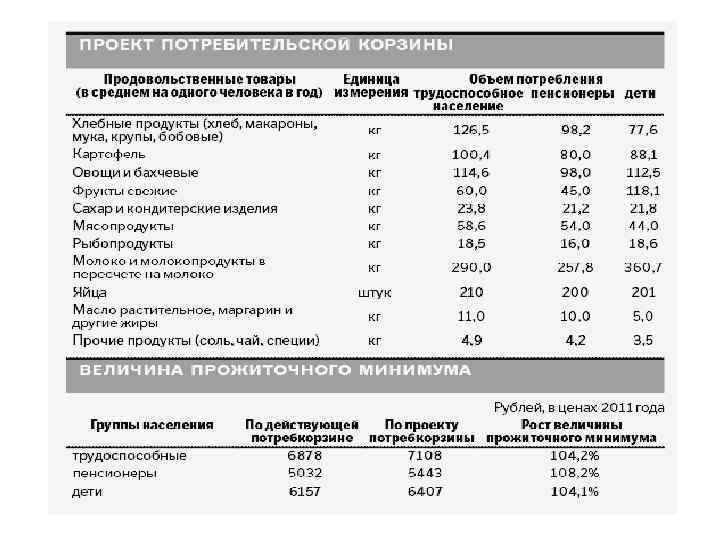 • Итак, если вы посмотрите в приведенную ниже таблицу, где представлены продукты и услуги, входящие в потребительскую корзину на 2014 год, то убедитесь, что согласно расчетам правительства, трудоспособный гражданин, употребляет за год 100, 4 кг. картофеля, 114, 6 кг. овощей, 60 кг. свежих фруктов, 126, 5 кг. хлеба и хлебопродуктов, 58, 6 кг. мясных и 18, 5 кг рыбопродуктов соответственно. Услуги культуры составляют 5% от общей величины расходов в месяц. • Источник: Потребительская корзина на 2014 год: состав сайт bs-life. ru
