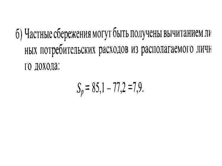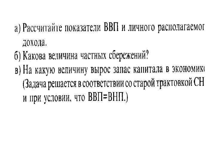 РЕШЕНИЕ: • • 1. Расчет ВНП по доходам выглядит следующим образом: Зарплата и жалованье (218 ден. ед. ) + Доходы от собственности (21 ден. ед. ) + Рентные платежи (20 ден. ед. ) + Прибыль корпораций (113 ден. ед. ) + Процент за кредит (12 ден. ед. ) - Субсидии государственным предприятиям (2 ден. ед. ) + Косвенные налоги, неналоговые обязательства и трансфертные платежи, выплачиваемые частными предпринимателями (22 ден. ед. ) • + Плата за потребление капитала (валовые инвестиции – чистые инвестиции) (10 ден. ед. ) • = 414 ден. ед.