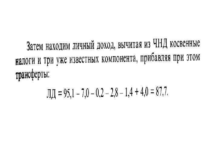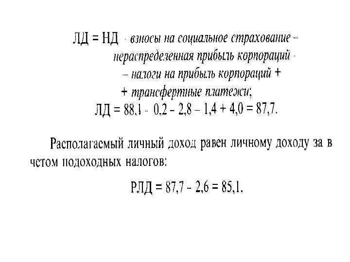 Личный доход граждан (ЛД) - из величины ВД следует вычесть: взносы на социальное страхование граждан, прибыль корпораций, уплаченные проценты за кредит и прибавить: дивиденды; трансфертные платежи, процентный доход.