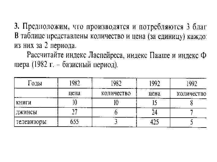 Годы 1982 цена 1982 количество 1992 цена 1992 количество Книги 20 15 18 13 Джинсы 30 8 25 9 Телевиз оры 700 5 750 8