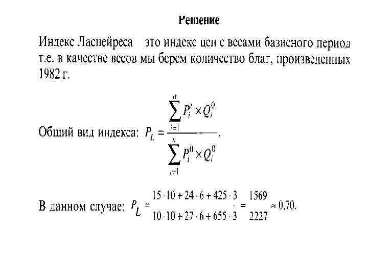 ИНДЕКС ЦЕН ЛАСПЕЙРЕСА показывает, на сколько изменились цены в отчетном периоде по сравнению с базисным, но на товары реализованные в базисном периоде. Иначе говоря индекс цен Ласпейреса показывает во сколько товары базисного периода подорожали или подешевели из-за изменения цен в отчетном периоде.