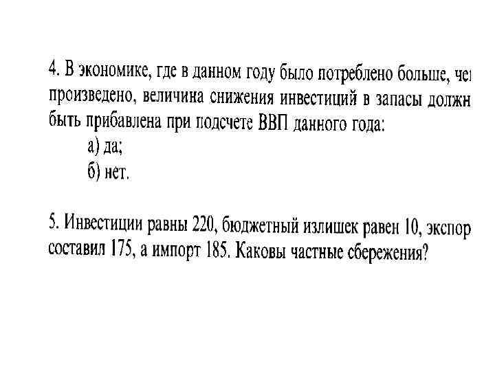 • В открытой экономике совокупный объем выпуска (совокупный продукт) (Y) составляет 4000 млрд дол. , потребительские расходы — 2600 млрд дол. , инвестиции — 900 млрд дол. , государственные закупки — 850 млрд дол. , чистые налоги — 800 млрд дол. Величина частных сбережений равна: • а) 550 млрд дол. ; • б) 600 млрд дол. ; • в) -50 млрд дол. ; • г) -350 млрд дол. ;