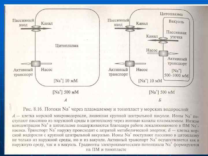 n n n Особенности приспособления растений n к условиям засоления Концентрация солей выше 5% летальна для большинства растений. Однако существуют виды, адаптированные к произрастанию даже в условиях сильного засоления. При этом используется различная стратегия. Растения пытаются избежать накоплекния солей (даже при их интенсивном поступлении) рис. 6. 1) или приспосабливаются к их высокой концентрации. Избежание засоления Для создания высокого осмотического давления и усиления поступления воды растения могут поглощать большое количество солей, однако для защиты цитоплазмьт от избытка солей их необходимо концентрировать в вакуолярном соке. Высокое содержание ионов в почве при засолении создает предпосылки для их пассивного поглощения по градиенту концентрации, т е, без затрат АТФ,