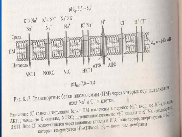 n n n Na және Сl топырақ ерітіндісінен клеткаларға кіруі. Na және Сl топырақ ерітіндісінен тамырдың эпидермис және қабық клеткаларының цитоплазмасына электрохимиялық потенциал градиенті арқылы кіреді Na және Сl сыртқы ортадан клеткаға тасмалдайтын плазмалемманың белоктары. Na және басқа иондар мембрананың қосқабатынан кіре алмайды. Олар иондық канал және тасмалдаушылар арқылы кіреді. Na- каналдар, жануарлардың Na-каналдарына ұқсас. Тамыр клеткаларда кейбір белоктар табылған. Олар арқылы иондар ЦП-ға кіреді. Ондай белоктарға ПМ-ның К+-каналдар жатады.
