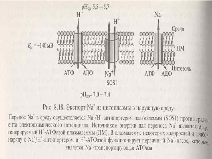 n n n n n Бірінші реттік Na-насос (Na+-АТФаза). Кейбір ашытқыштардың және галотолерантнттық балдырлардың ПМда 1–ші реттік Na –насостар табылды. Олар фосфордың энергиясын пайдаланатын Na+тасмалдайтын АТФазалар. Олар Р-тип АТФазаларға жатады. Жоғары сатылы өсімдіктерде олар болмайды. Тонопластың Na/Н-антипортері. Тонопласта Na/Н-антипортер және Н-АТФазада жұмыс істейді. Бұл АТФаза V-типке жатады, олар Нпротондарды ЦП-дан вакуольге тасмалдайды. ПМ мен тонопластағы Сl-ды экспорттайдын жүйелер. Хлордың экспорты анион каналдар арқылы жүзеге асады. Тасмалданудың бағыты ПМ және тонопластың эл/химиялық потенциалымен белгіленеді. Н-АТФаза ПМ, Н-АТФаза тонопластта и Н+пирофосфатаза тонопластта — эл/химиялық потенциалды туғызады.