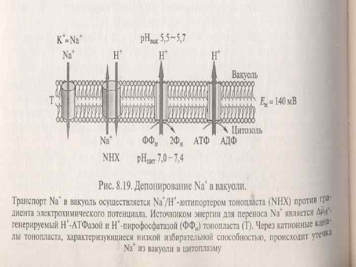 n n n Откачивание ионов из клетки в окружающую среду или в вакуоль осуществляется активно, с участием АТФаз. При избытке солей меняются свойства ионных каналов, определяющие степень солеустойчивости. У галофита проводимость канала больше, чем у гликофитов. Под влиянием калия уменьшается Na-Mg-засоление. При засолении, особенно натрий-хлористом, происходит значительное накопление соли в апопласте растительных клеток. Ионная проницаемость плазмалеммы повышается, поэтому хлор из клеточной стенки легко проникает в клетки через хлорные каналы и в симпорте с протоном, а натрий поступает через неспецифические катионные каналы, конкурируя с калием в калиевых каналах и на переносчиках. Уровень ионов хлора и особенно натрия в цитоплазме значительно увеличивается. что способствует активации систем ионного гомеостатирования.