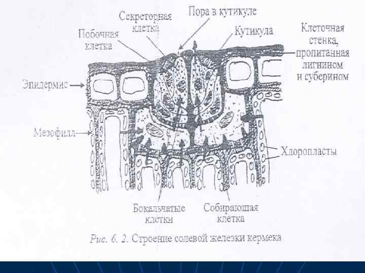 n n n Поглошенные соли выводятся также из клеток с водой с помощью специализированных соленых железок, или избыток солей удаляется с опавшими листьями, Солевые железы листьев и стеблей растений выделяют избыток ионов при их росте в высокосолевой среде. Собирательные клетки железок мало чем отличаются от элидермалных, но клеточная стенка у них значительно утолщена и лигнифицирована. Эти клетки связаны многочисленными плазмодесмами с окружающими их клетками мезофилла и эпидермиса, а также с бокальчатыми клетками. Секреторные, побочные и бокальчатые клетка также связаны друг с другом через плазмодесмы, их клеточные стенки пропитканы не только лигнином и суберином, что исключает апопластный транспорт.