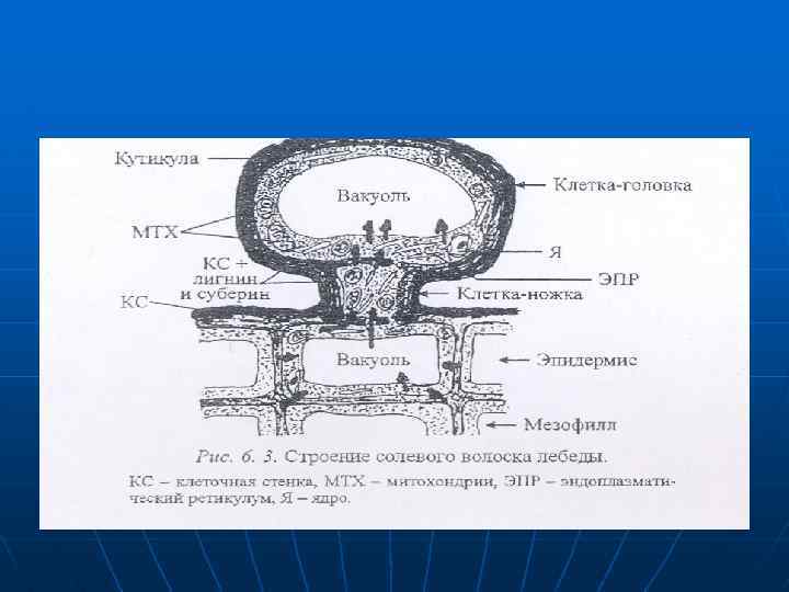 n n n Поглощаемые соли могут концентрироваться и в вакуолях клеток головок специализированных волосков (рис. 6. 3). Когда в вакуолях головки накапливаются соли головка обрывается, на ее месте несколько раз в течение роста листа образуется новая головка. Солевые волоски состоят из ножки и головки, В собирающей клетке-ножке, не имеющей центральной вакуоли много митохондрий и цистерны ЭПР.