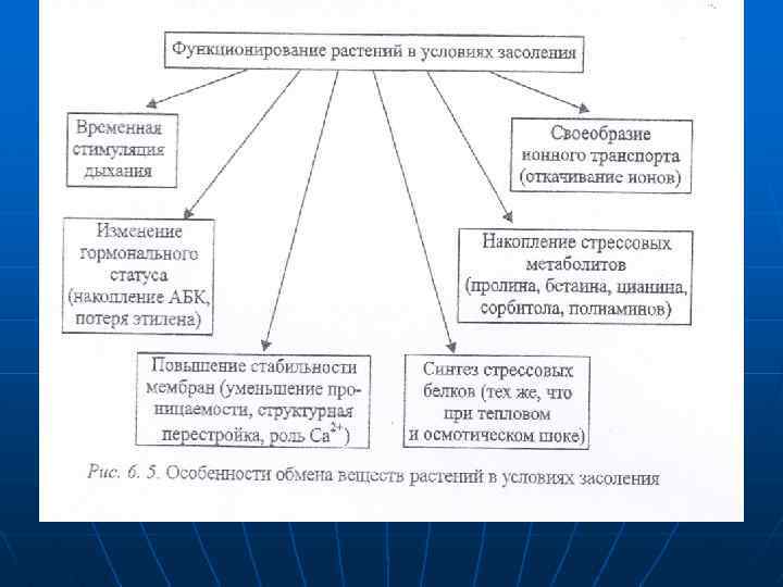 Относительной устойчивостью обладают ячмень, сахарная свекла, хлолчатник. , мягкая пшеница, в большей степени, чем твердая. Накапливаются соли в основном в старых тканях. Увечеличение концентрации солей в цитоплазме клеток служит сигналом к переходу обмена веществ на новый режим. Качественные изменения в метаболизме растений под влиянием соленого стресса однотипны у растений с разным уровнем устойчивости. Отмечаются лишь количественные различия скорости и амплитуды отклонения физиологических показателей от нормы. У приспособленных растений амллитуда меньше, чем у неприспособленных. Особенности функционирования растений при избытке солей представлены ка рис. 6. 5.